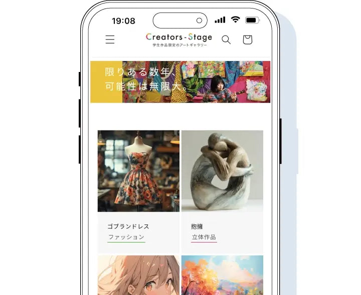 Creators-Stageは、学生・生徒作品限定のアートギャラリーです。大学・学校所属の学生・生徒のみが出展可能です。卒業後は作品登録や更新はできませんが作品掲載は継続します。学生・生徒の創り出す作品をもっと安全に、もっと安心に、より多くの人々へ届けるためのサービスです。