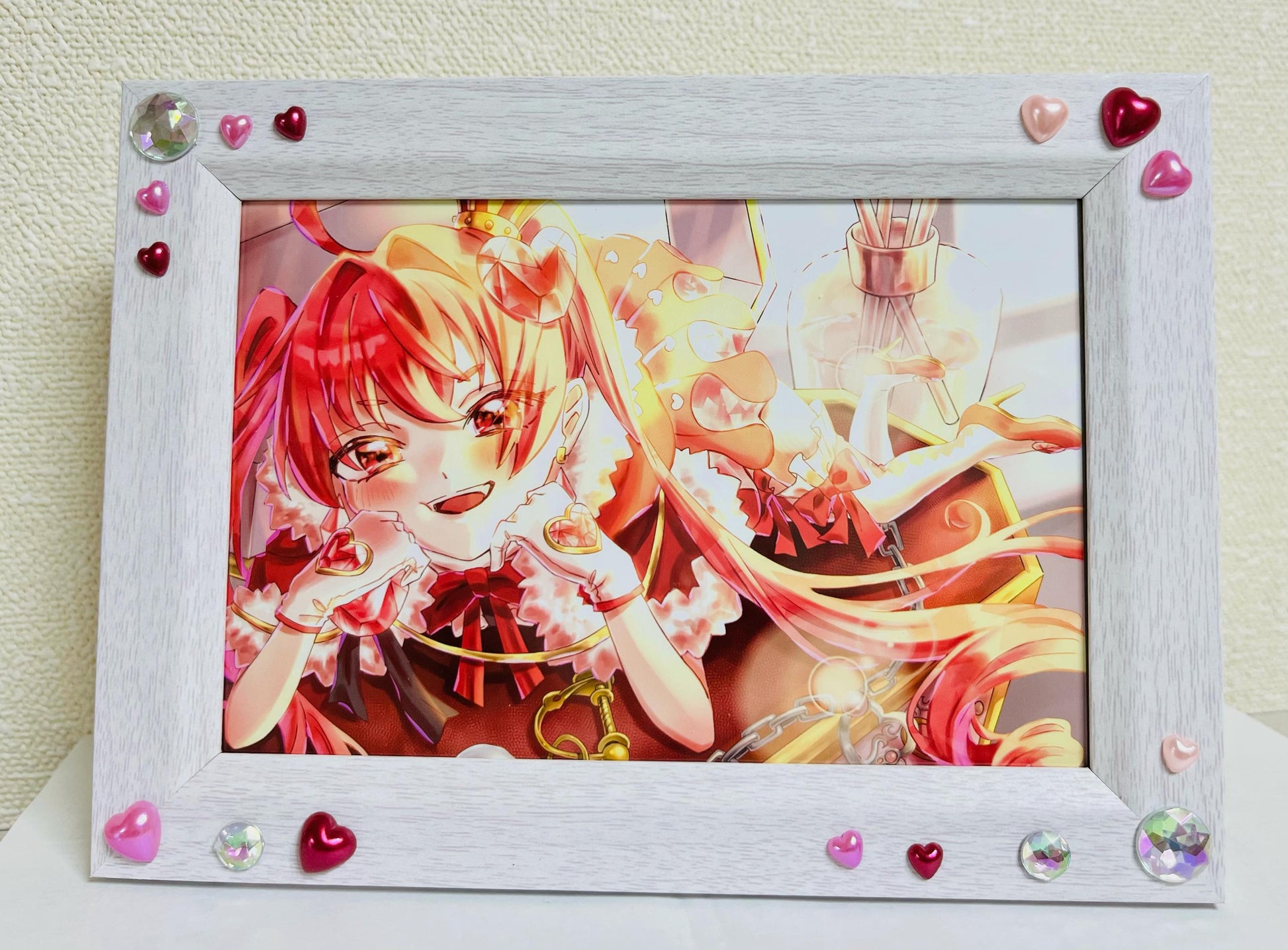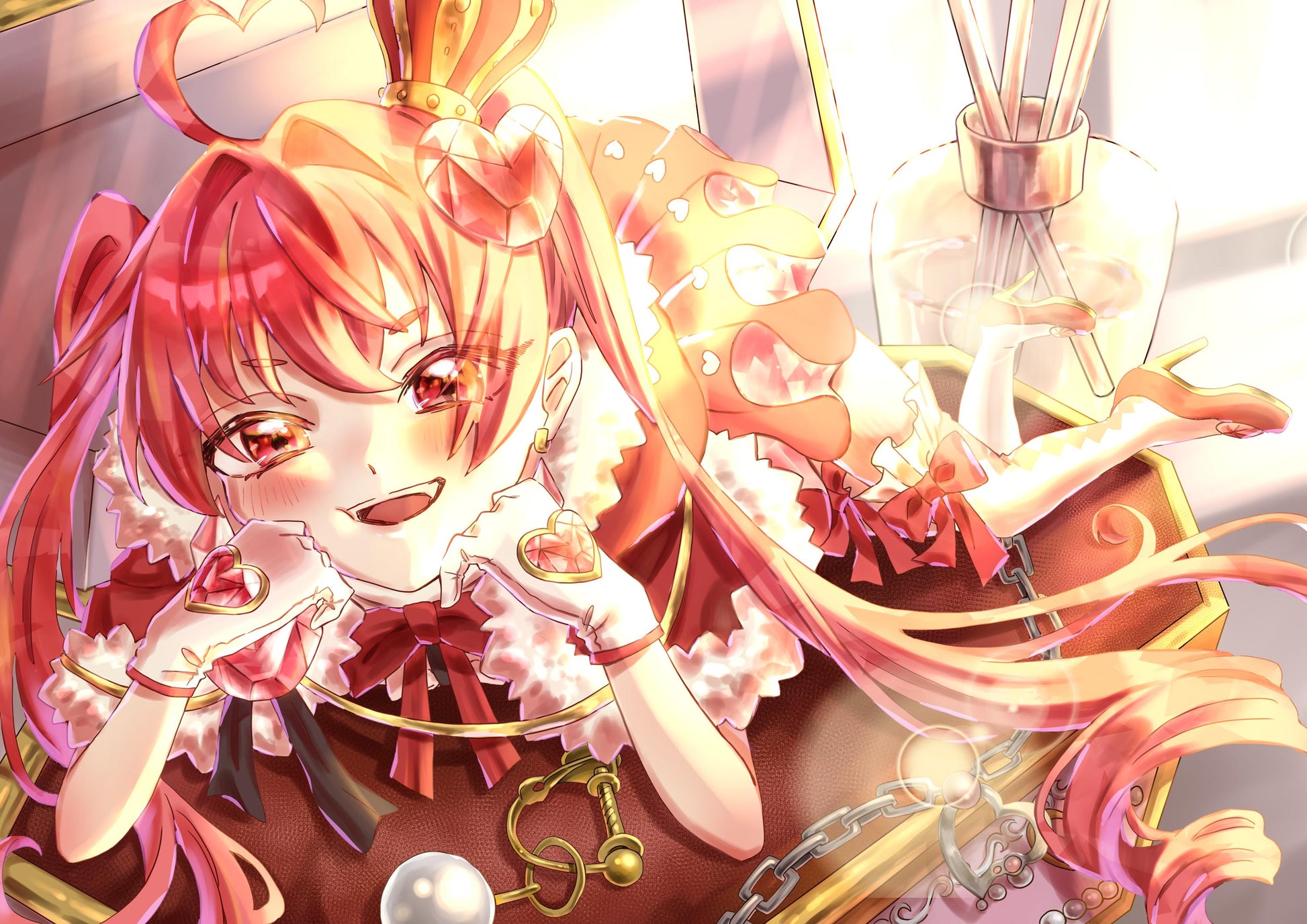 女の子のデザインの元になった、ルビーの石言葉の一つに「愛情」があります。この絵は「愛情」をテーマに制作しました。表情だけでなく奥から差す光からも、暖かな愛情が感じられると思います。また鑑賞者が絵を見たときに、まるで絵の中の女の子が見つめ返しているような構図で描きました。「愛情」は人から人へ、または人から物へ向けられる感情です。なので、絵の中の女の子と鑑賞者の間で「愛情」が成立するように構図を工夫しました。